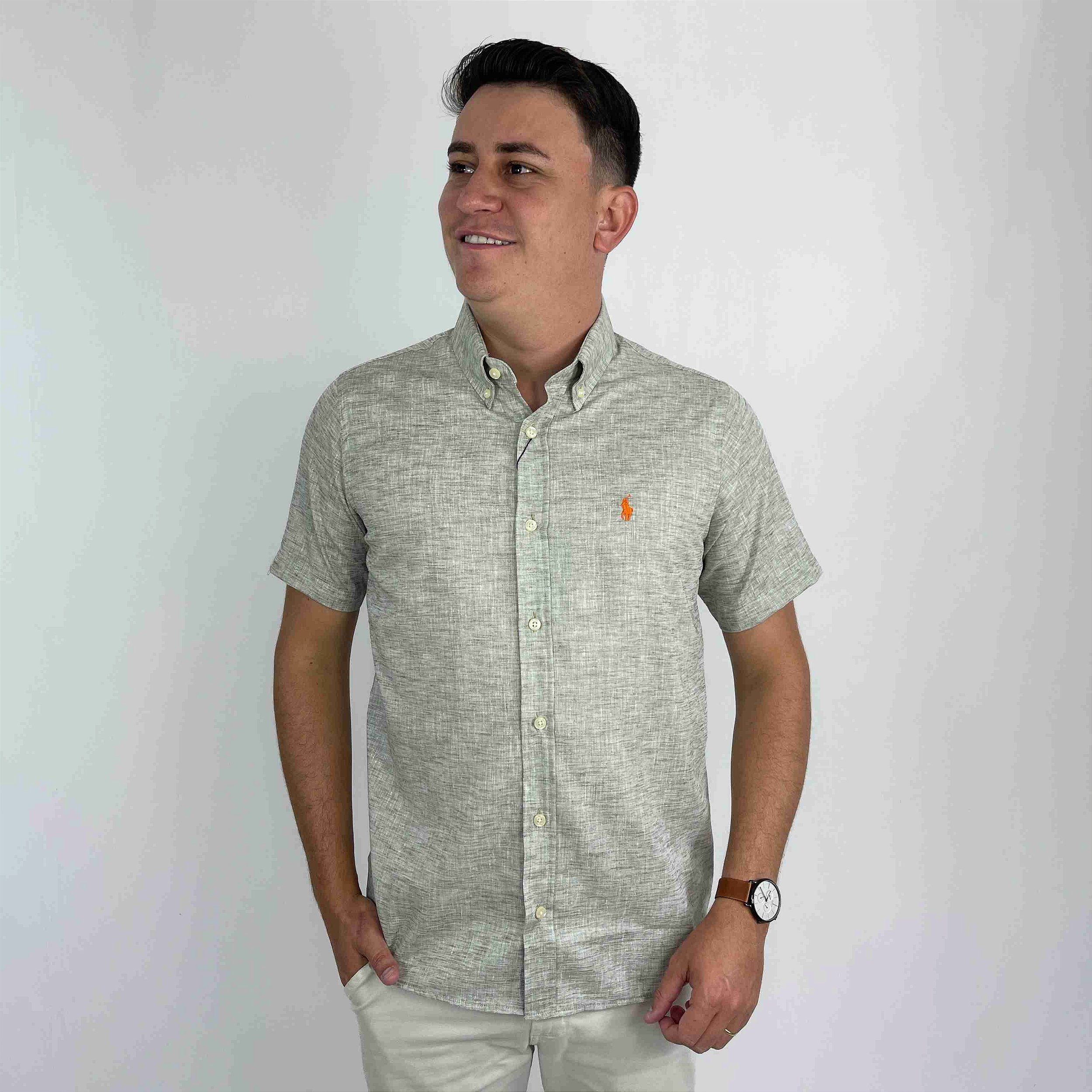 Camisa Ralph Lauren Manga Curta Linho Cinza Mescla Logo Clássico Laranja