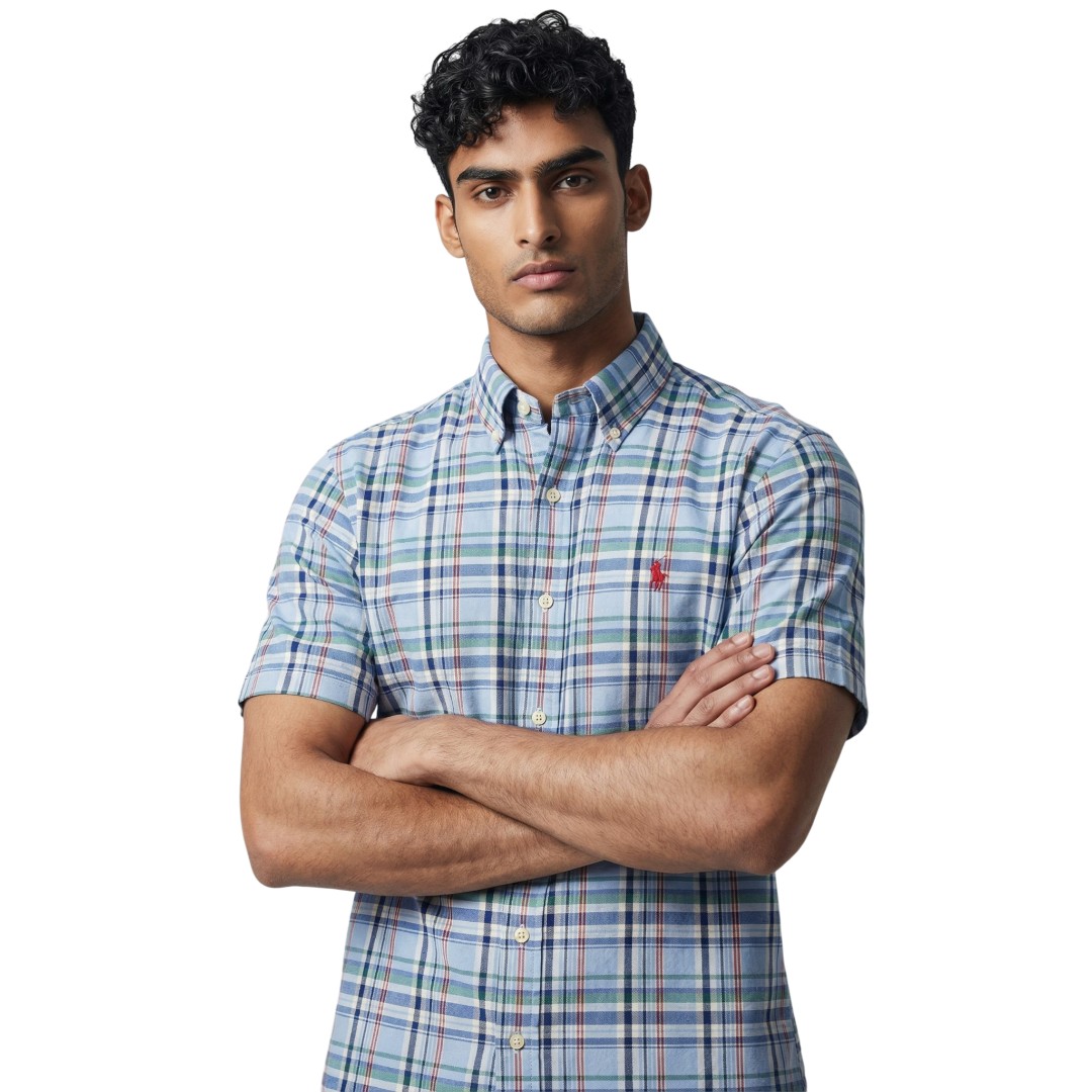 Camisa Ralph Lauren Manga Curta Oxford Xadrez Azul Claro Multicolor Classico Vermelho