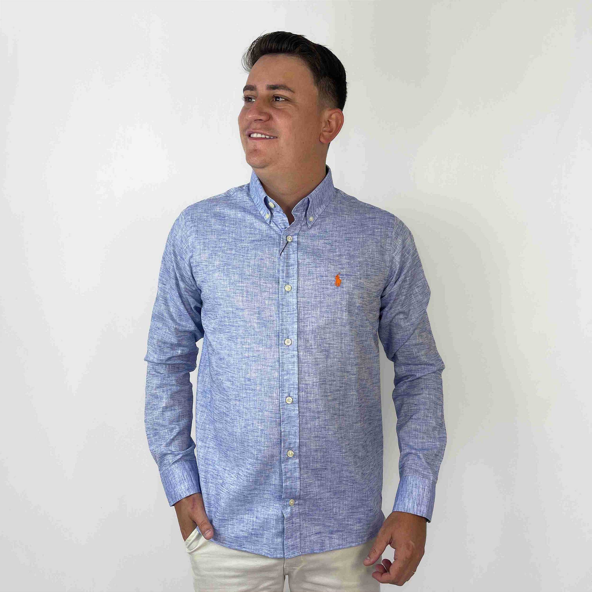 Camisa Ralph Lauren Manga Longa Linho Azul Royal Logo Clássico Laranja