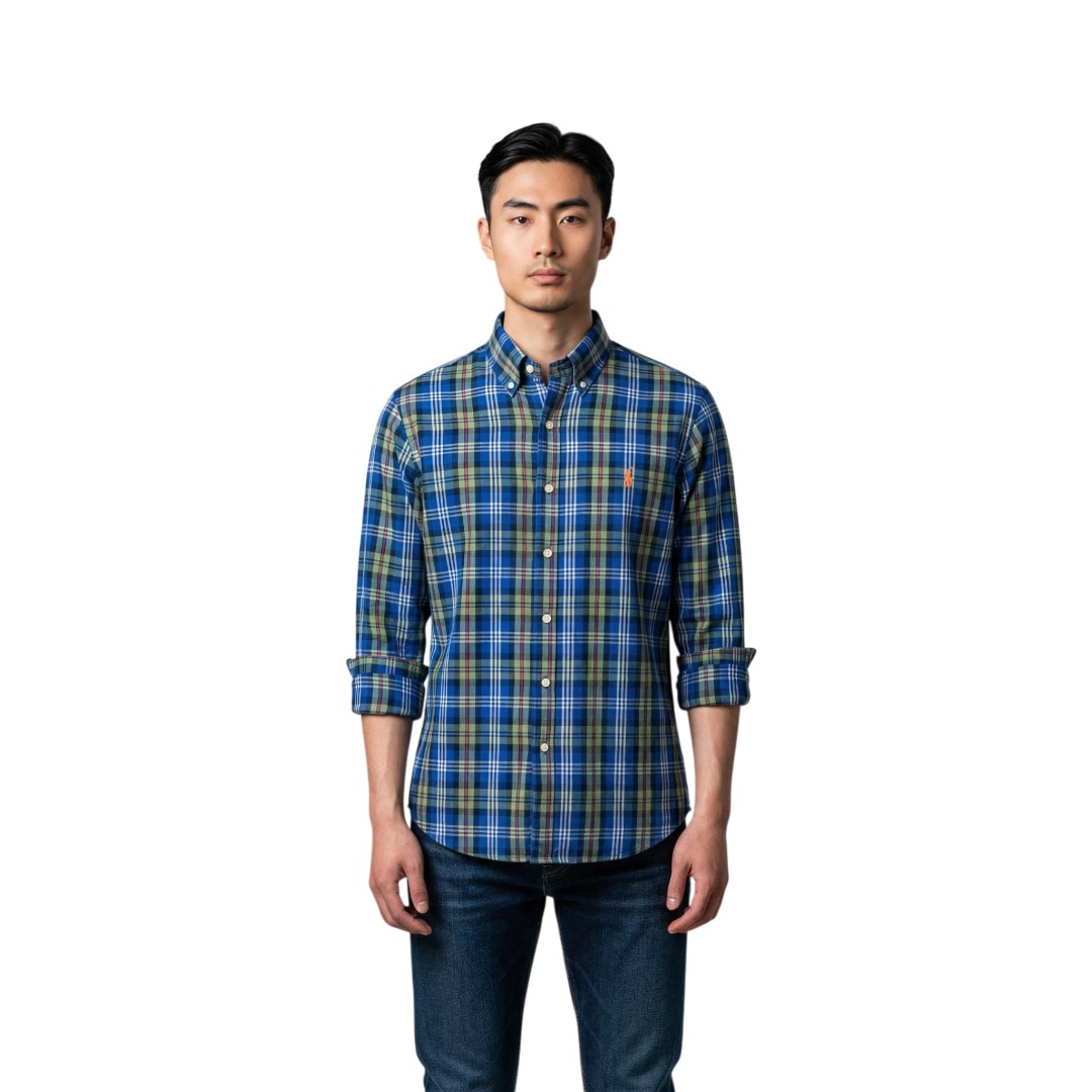 Camisa Ralph Lauren Manga Longa Oxford Xadrez Verde Militar Multicolor Classico Laranja