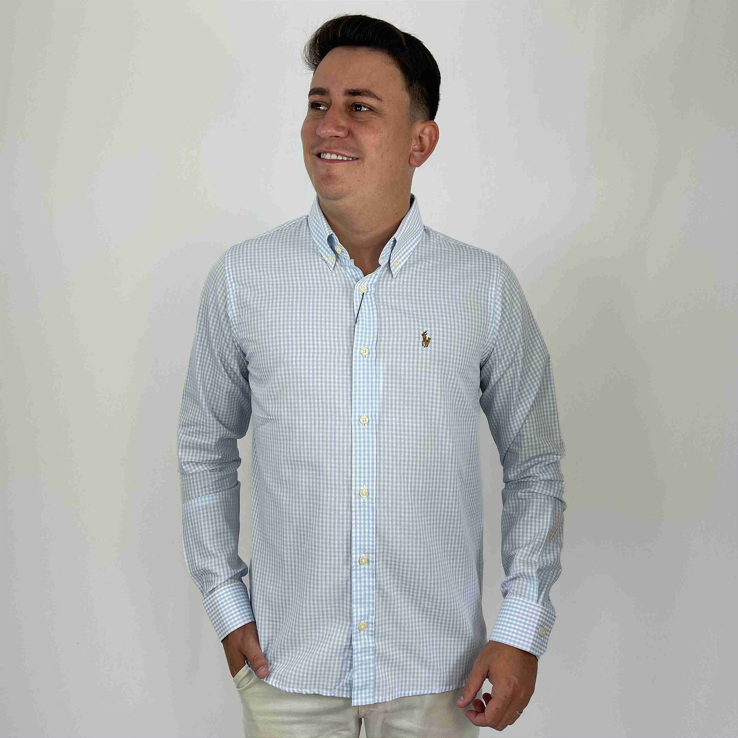 Camisa Ralph Lauren Manga Longa Xadrez Azul Claro Logo Colorido