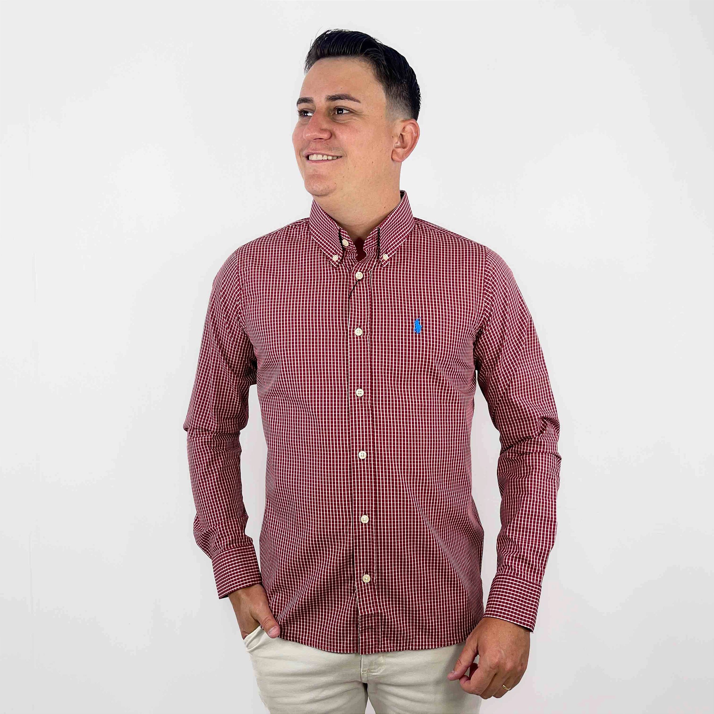 Camisa Ralph Lauren Quadriculada Manga Longa Vermelho Logo Clássico Celeste