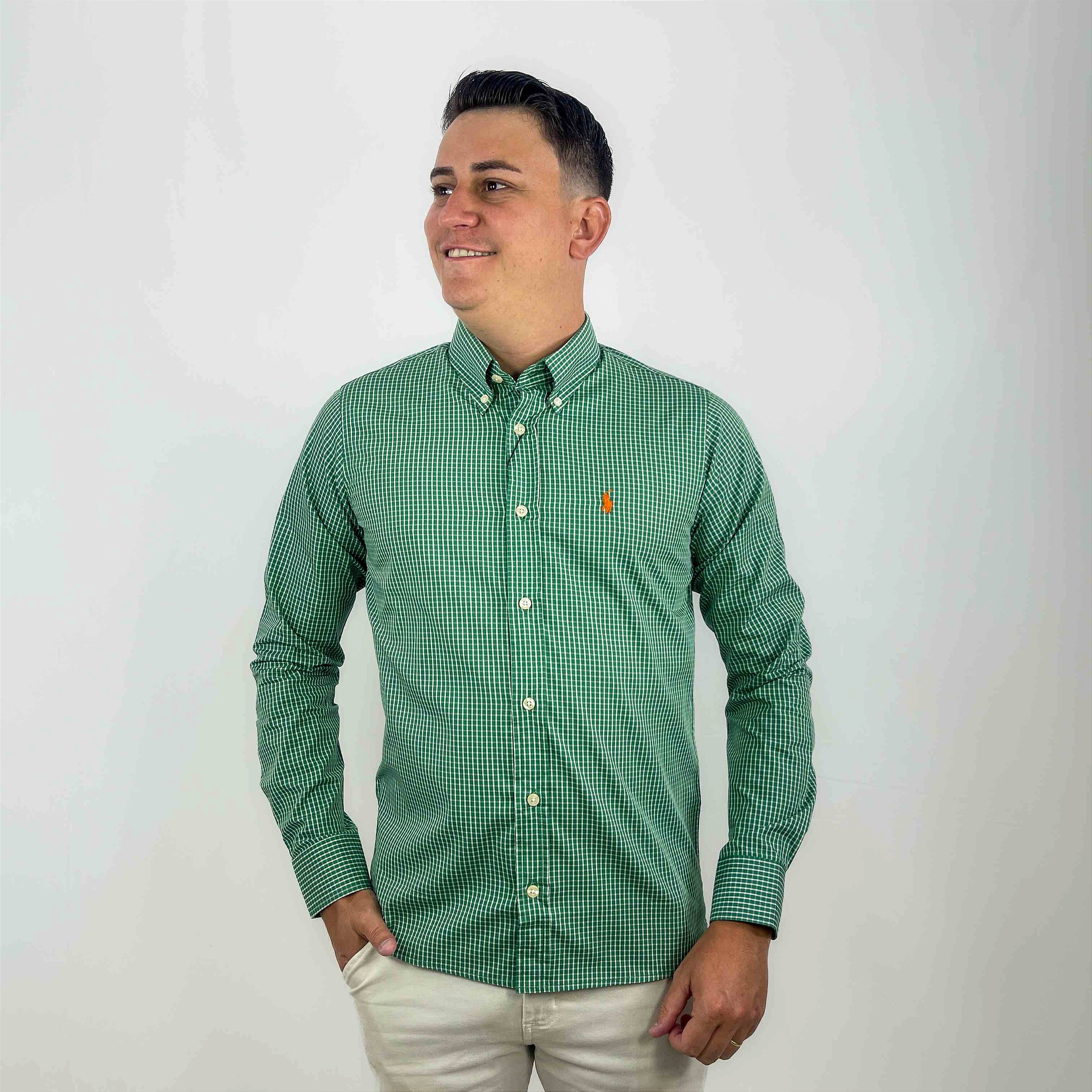 Camisa Social Quadriculada Manga Longa Verde Logo Clássico Laranja