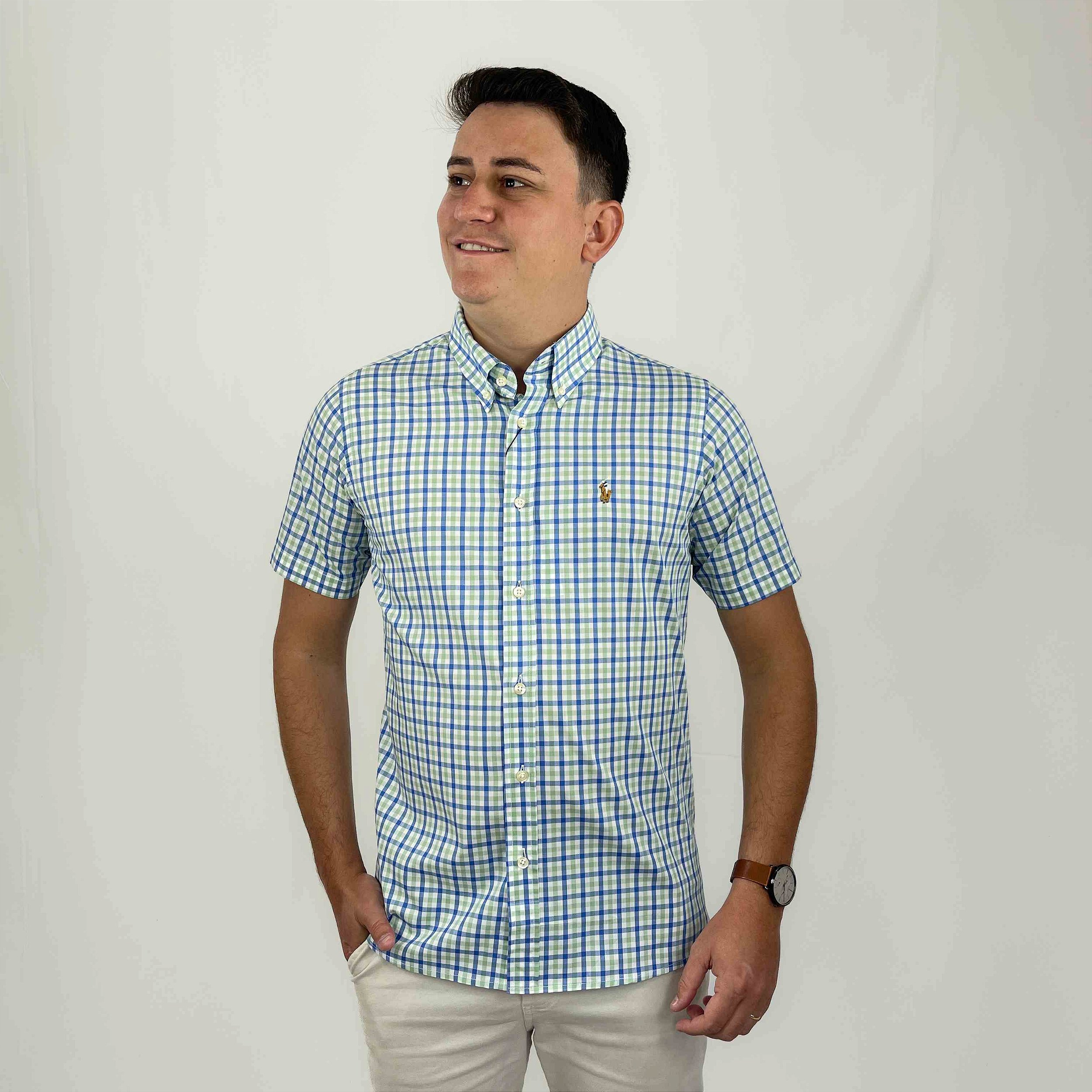 Camisa Social Ralph Lauren Xadrez Manga Curta Multicolor Verde Logo Colorido